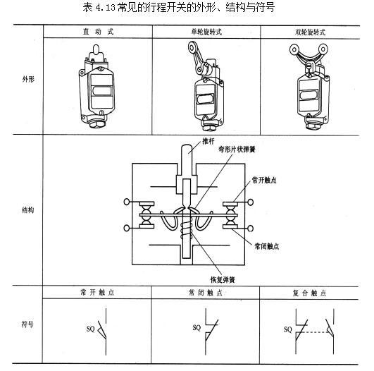 行程開關主要由操作機構、觸點系統和外殼3部分構成。行程開關種類很多,一般按其機構可分為直動式、轉動式和微動式。常見的行程開關的外形、結構與符號,如表4.13所示。